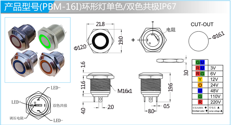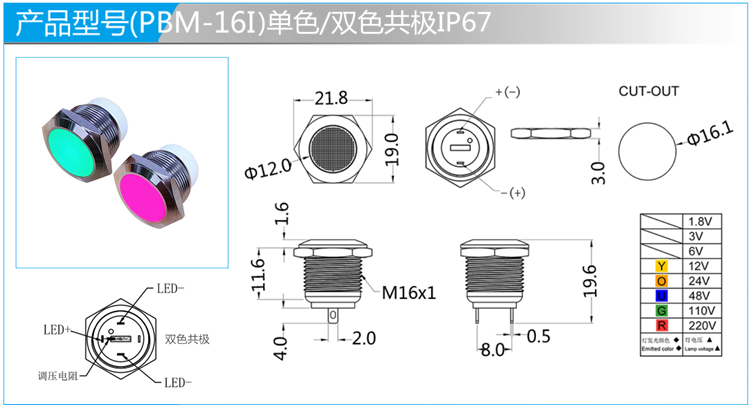 內部防水指示燈,整體發光或環形發光的選擇,單色、雙色共(gòng)極,可配線。